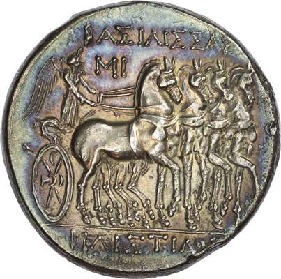 Diademed and veiled bust of Philistis facing left. Rev. ΒΑΣΙΛΙΣΣΑΣ / MI / ΦΙΛΙΣΤΙΔΟΣ, Nike driving quadriga right, holding reins. (SNG ANS -). Extremely Fine. Beautiful cabinet tone. Rare.