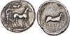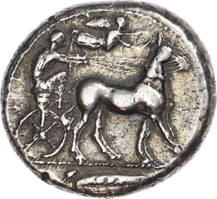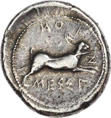 Charioteer driving a biga of mules right, Nike flying above, crowning the mules, olive leaf in exergue. Rev. MEΣΣ-ΑNION, hare springing right. (Caltabiano Series VIII; Randazzo 195-9; HGC 2, 782). Very Fine. Pleasing tone. Die break to reverse.