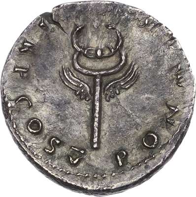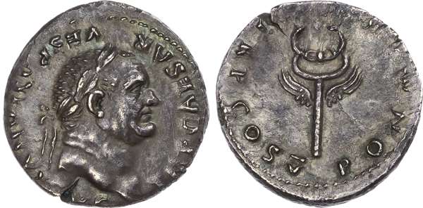 IMP CAESAR VESPASIANVS AVG, laureate head of Vespasian right. Rev. PON MAX TR P COS V, winged caduceus. (RIC 703; BMC 138; RSC 362). Extremely Fine. Large flan. Pleasing dark toning with hints of purple.