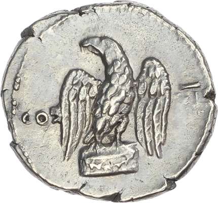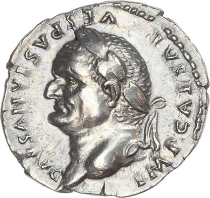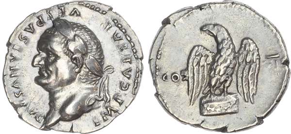 IMP CAESAR VESPASIANVS AVG, laureate head of Vespasian left. Rev. COS – VI, eagle standing facing, head left, on garlanded altar. (RIC 848; BMC 184; RSC 120). Extremely Fine. Scarce. High relief portrait.