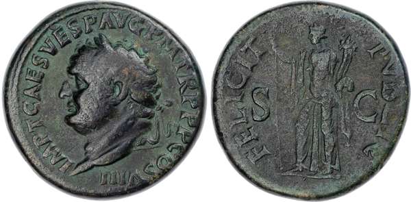 IMP T CAES VESP AVG P M TR P P P COS VIII, laureate head of Titus left. Rev. FELICIT PVBLIC, Felicitas standing left, holding sceptre and cornucopiae, S-C across fields. (RIC 144; BMC 158) Very Fine.