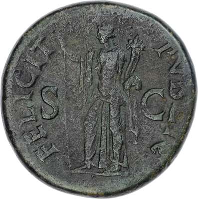 IMP T CAES VESP AVG P M TR P P P COS VIII, laureate head of Titus left. Rev. FELICIT PVBLIC, Felicitas standing left, holding sceptre and cornucopiae, S-C across fields. (RIC 144; BMC 158) Very Fine.