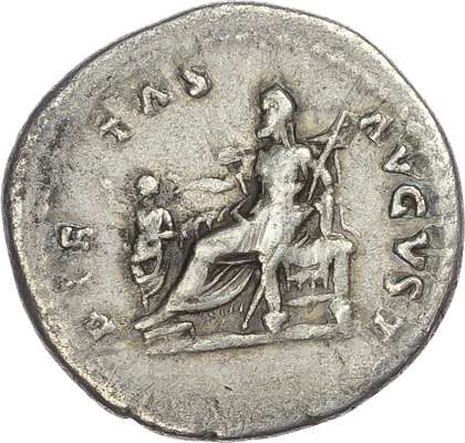 DOMITIA AVGVSTA, draped bust of Domitia right. Rev. PIE-TAS AVGVST, Pietas seated left, holding sceptre and extending hand towards child standing left. (RIC 156; BMC 65; RSC 12). Good Very Fine. Pleasing cabinet tone. Rare. An attractive example of this difficult issue.