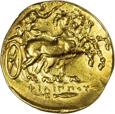 Laureate head of Apollo facing right. Rev. ΦΙΛΙΠΠΟΥ, charioteer driving biga right, caduceus and spearhead below. (Le Rider 265). Good Very Fine. Full flan. Ex. Mount.