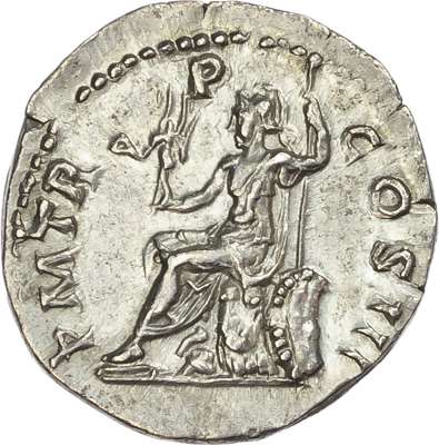 IMP CAESAR TRAIAN HADRIANVS AVG, laureate bust head of Hadrian right, with slight drapery over left shoulder. Rev. PM TR P COS III, Roma seated left on pile of arms, holding Victory and sceptre.(RIC 541). Extremely Fine. Lustrous.
