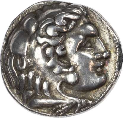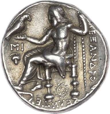 Posthumous issue, mint of Babylon I, struck under Seleukos I, c. 311-300 BC, 16.29g. Head of Herakles facing right, wearing a lionskin headdress. Rev. ΑΛΕΞΑΝΔΡΟΥ, Zeus seated left, holding eagle and sceptre, MI and bunch of grapes in left field, monogram in wreath below throne. (SC 82.3b). Good Very Fine. Some light scratches. Plated Copy.