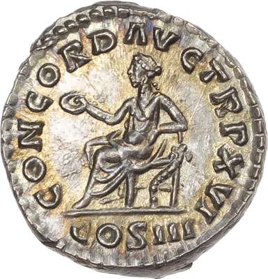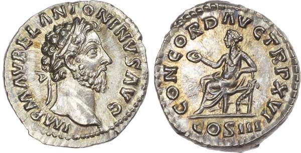 IMP M AVREL ANTONINVS AVG, laureate head of Marcus Aurelius right. Rev. CONCORD AVG TR P XVI, Concordia seated left, holding patera, COS III in exergue. (RIC 35; BMC 177). Good Extremely Fine. Iridescent lustre.