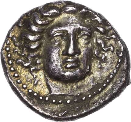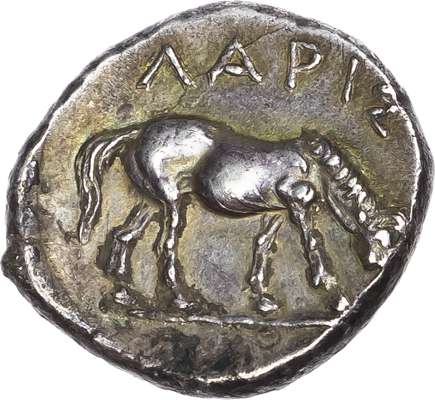 Head of the nymph Larissa facing slightly to the right. Rev. ΛΑΡΙ, horse grazing right. (BCD Thessaly II, 250. HGC 4, 430). Good Very Fine. Pleasing cabinet tone.