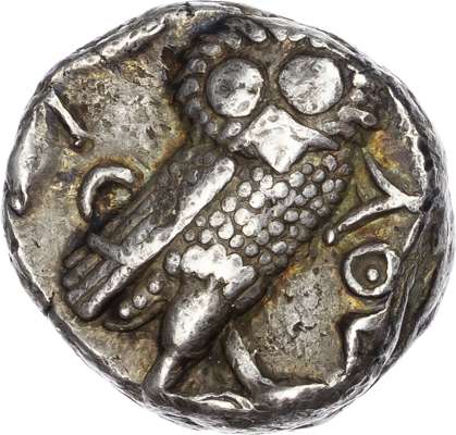 Helmeted head of Athena facing right. Rev. Owl standing right, olive-sprig behind, AΘE to right. (BMC 132 pl. 5/3; SNG Delepierre 1477). Fine. Weakly struck on a dumpy flan.