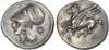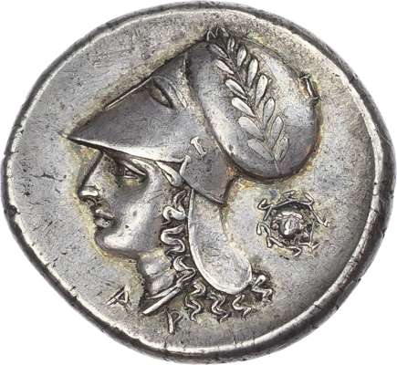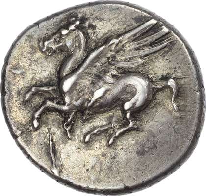 Pegasos flying left, Ϙ below. Rev. Head of Athena facing left, wearing a Corinthian helmet decorated with a wreath, A-P below truncation, aegis to right. (Pegasi 262; Ravel 1009). Obverse Good Very Fine. Reverse Extremely Fine and of pleasing style. Attractive cabinet tone. An excellent example.