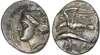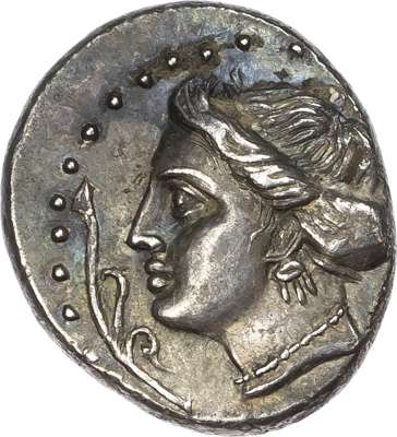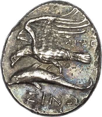 Head of nymph left, hair bound in sakkos. Rev. Sea-eagle left on back of dolphin left, magistrate's name above. (SNG BM 1481; SNG Stancomb 770). Good Very Fine or better. Attractive tone.