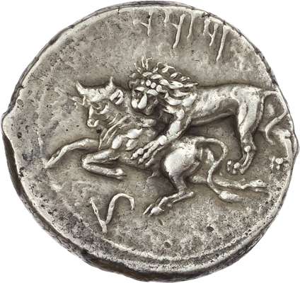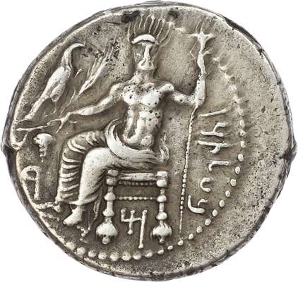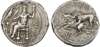 Baaltars seated left, holding grapes, grain ear and eagle in right hand, sceptre in left. Rev. Lion attacking bull left, MZDI in Aramaic above. (SNG France 350 var.; S. 5650). Good Very Fine.