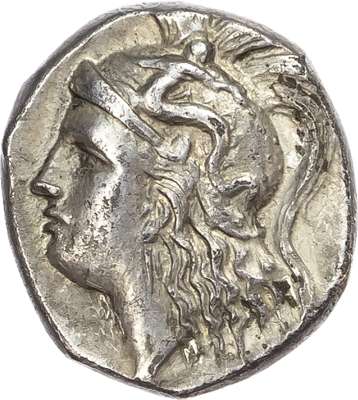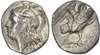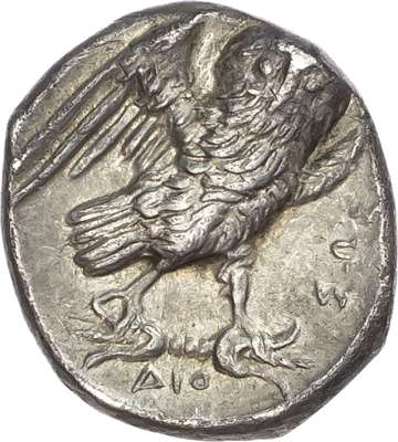 Head of Athena facing left, helmet decorated with Scylla motif. Rev. Owl standing right on thunderbolt, ΣΩ to right, ΔI below. (HN Italy 1018; Vlasto 1068-74). Nearly Extremely Fine.