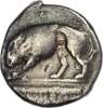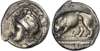 Head of Athena left, wearing crested Phrygian helmet decorated with sphinx motif. Rev. YEΛHTΩN, lion standing left, tearing at prey. (HN Italy 1296; SNG ANS 1339). Fair.