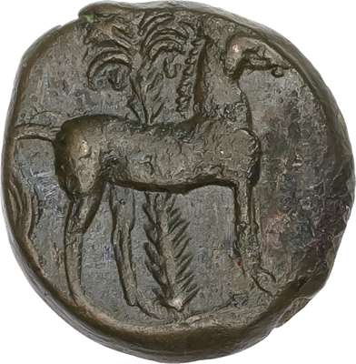 Wreathed head of Tanit left. Rev. Horse right, palm tree behind. (SNG Copenhagen 103-13). Good Very Fine.