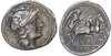 Helmeted head of Roma facing right, [X] (mark of value) behind. Rev. Victory driving biga right, holding reins and whip, NATA below, ROMA in exergue. (Crawford 208/1; Sydenham 390). Good Fine.