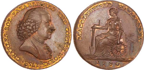 Macclesfield, Roe & Co. Halfpenny 1790 (engraved by Hancock, manufactured prob. by Westwood). Draped bust of Charles Roe right, rev. industry seated left holding auger and cogwheel, edge PAYABLE AT MACCLESFIELD LIVERPOOL OR CONGLETON .x. 30mm/12.46gm. (DH 16). Another similar, but top bar points to lower limb of N on rev., 31mm/12.72gm. (DH 18). Another similar but lower bar points to Y on rev., 30mm/12.61gm. (DH 20), Another similar, but top bar to first limb of N on rev., 30mm/12.50gm. (DH 21), all good Extremely Fine, first with some original mint bloom, rest with considerable amounts of lustre. DH 18 scarce. [4]
