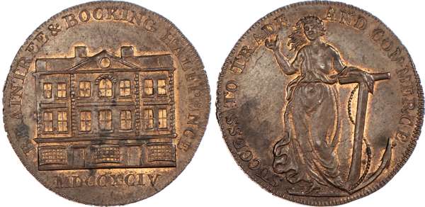 Braintree and Bocking, William Goldsmith Halfpenny 1794, Facade of Georgian building, rev. Hope standing with anchor, edge, PAYABLE AT W GOLDSMITHS BRAINTREE ESSEX X X . 29.5mm/9.74gm. (DH 3). Another similar but slight difference in spacing of rev. legend, 29mm/8.98gm. (DH 4), both good Extremely Fine, first with some original lustre, second toned with reflective surfaces, first Rare. [2]
