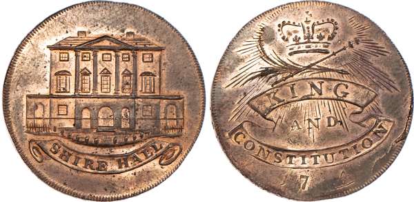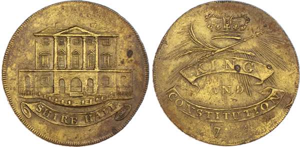 Chelmsford Clachar & Co. (Book-sellers and binders) Halfpenny 1794, façade of the (newly built) Shire Hall, rev. crown over ‘King and Constitution’, edge, PAYABLE AT CLACHAN AND CO’S CHELMSFORD ESSEX, 29mm/9.54gm. (DH 5). Another the same but in brass, 29mm/10.09gm. (DH 5). Another similar but different edge – PAYABLE IN HULL AND IN LONDON ‑X‑X, 28.5mm/10.09gm. (DH 5b), Brass piece not quite Extremely Fine, but very rare in this off‑metal; other two good Extremely Fine, first with almost full lustre, third, evenly toned. [3]