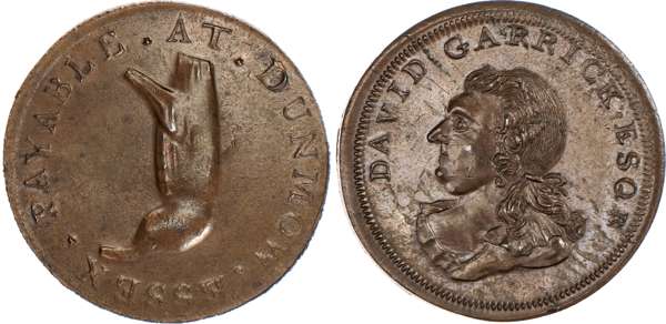Dunmow, Spence/Skidmore Mule Halfpenny no date, Flitch of bacon, rev. Bust of David Garrick left, (DH Middx 325), edge diagonally milled, 29.5mm/9.24gm. (DH 22). Another the same but plain edge, 30mm/11.64gm. (DH 22a), both good Extremely Fine, first with considerable amounts of lustre, second toned, both scarce. [2]