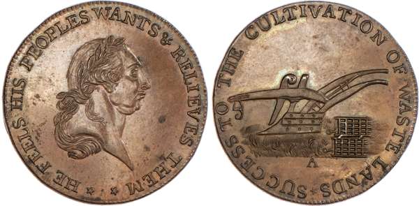 Badminton, David Arnot and John Jelly (Kempson mule) Halfpenny 1795, laureate bust of George III right, rev. plough and harrow, edge rounded, 29.5mm/9.49gm. (DH 26). Another but with wheatsheaf rev., 29mm/9.57gm. (DH 27), both good Extremely Fine, first toned second with considerable amounts of mint bloom, Scarce. [2]