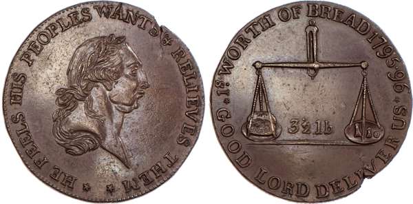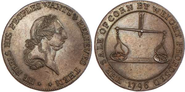 Badminton, David Arnot and John Jelly (Kempson mule) Halfpenny 1795, laureate bust of George III right, rev. empty scales, edge rounded, 29mm/9.7gm. (DH 28). Another but with 3½ lb. scales, 29mm/8.84gm. (DH 29). Another bronzed but with 6½ lb. scales, 29mm/9.62gm. (DH 30), all good Extremely Fine, first toned, second bronzed but with small edge flaw, third some lustre and much iridescence. All scarce. [3]