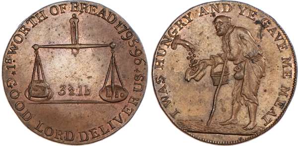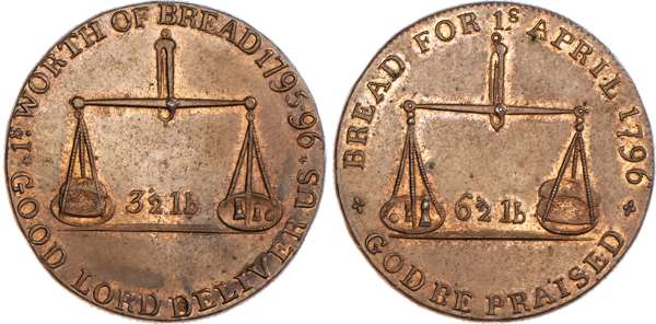 Badminton, David Arnot and John Jelly (Kempson mule) Halfpenny 1796, 3½ lb. scales, rev. beggar receiving largess, edge rounded, 29mm/9.26gm. (DH 53). Another but with 6½ lb scales rev., 28.5mm/9.65gm. (DH 54). Another but with 10-line legend re. the reduction of the price of wheat, in oaken wreath rev., 29mm/9.49gm. (DH 55), all three good Extremely Fine and all with considerable amounts of original mint lustre, Scarce. [3]
