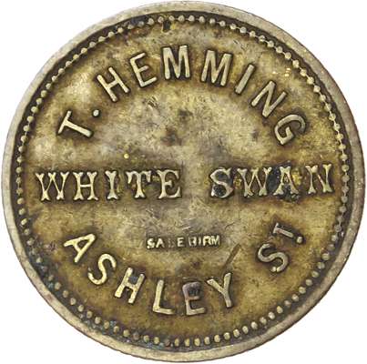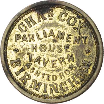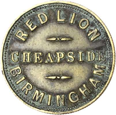 West Mids. Birmingham, City centre, Ashley St. White Swan, 2½d. 27mm. T Hemming, VF; City centre, Cheapside, Red Lion, 3d. 22mm. (Pope) gVF; City centre, Church St, White Hart, 2d. 25.5mm. Joseph Cobley, fair verd.; Duddeston, Saltley Rd. Sportsman Inn 2½d., 25.5mm., aVF; Duddeston, Ashted Row. Parliament House Tavern 2½d., 27mm., Chas. Cox gEF. [5]