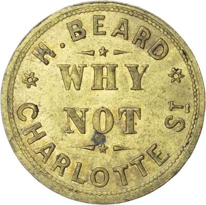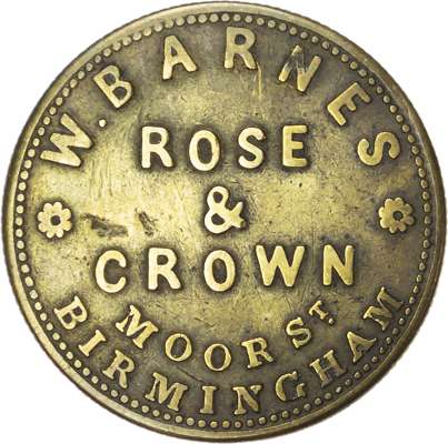 West Mids. Birmingham, City centre, High St. The Kensington, 2½d. 29mm. E Jordan. gF; City centre, Gt. Hampton Row. Star & Garter (pictorial), 2½d. 24mm. James Perry. gF, pierced; City centre, Jewellery Quarter, Charlotte St. Why Not, 1d. 25.5mm. H Beard, aEF; City centre, Moor St. Rose & Crown, 2½d. 27mm. W Barnes, (Wellard). Tamworth Arms , 2½d. 27mm. H Aspinall, UNC lustre . [5]