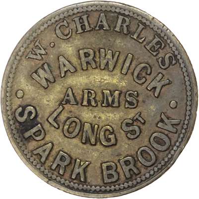 Lot of 4 coins - West Mids. Birmingham Sparkbrook, Ladypool Rd. Clifton Inn 3d. 24mm. W Owen, VF; Long St. Warwick Arms...