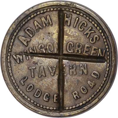 West Mids. Birmingham Spring Hill, Old College Inn , 2½d., 24mm. George Bedford, (Daniell). VF, cancelling pentagonal punch; , 3d., 24mm. W H Cooke. VF; West Side, Sherborne St., Spread Eagle, 3d., 26mm. William Rose; Winson Green, Lodge Rd. Winson Green Tavern 2d. 24mm. Adam Hicks (Middleton). gVF, cancelled with a large punched cross; Winson Green, Peel St., Sir Robert Peel , 3d., 25.5mm., H Onions, cm H, [5]