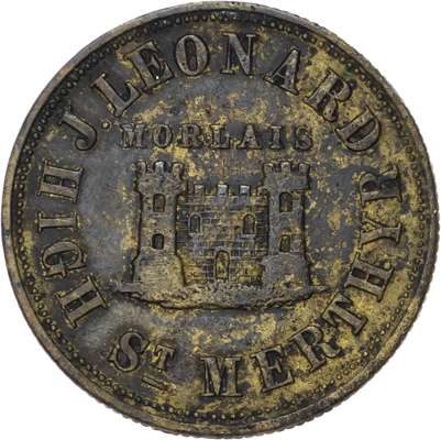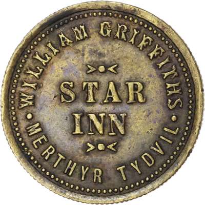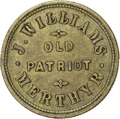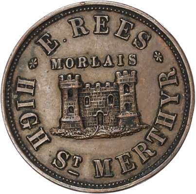 Glam. Merthyr Tydfil, Old Patriot, 3d. 23mm. J Williams. VF; Merthyr Tydfil, High St. Morlais (castle gate), 3d. 28.5mm. J Leonard. 3d. 28.5mm. E Rees. EF; Star Inn, no denom 27mm. William Griffiths, (Morris). g VF. [4]