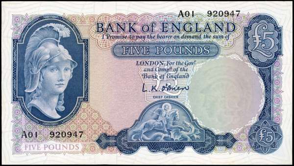 Bank of England, L K O’Brien, Blue Five Pounds, London, (1957 First run), A01 920947, (Dugg. B277). Crisp Uncir…