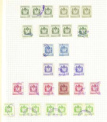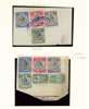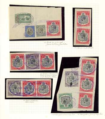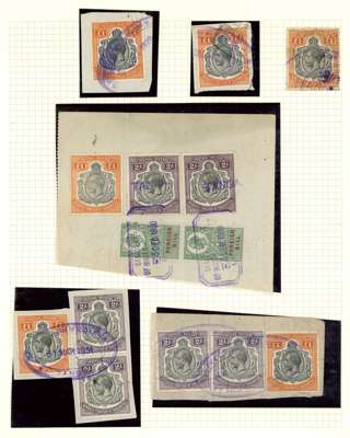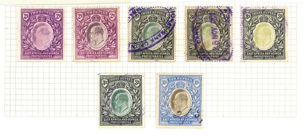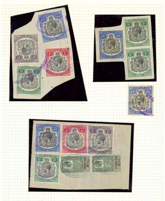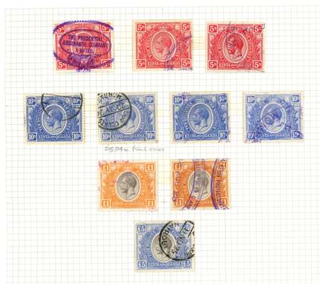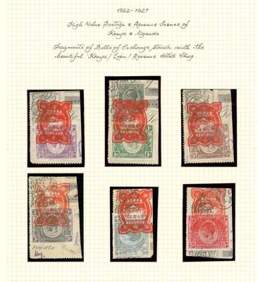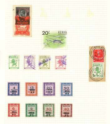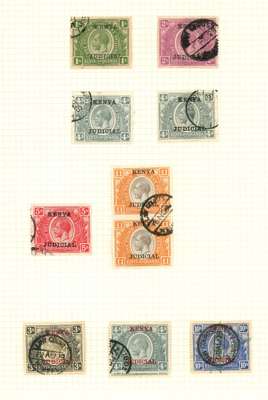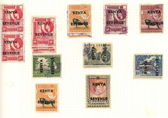 1901-80 balance collection on pages comprising 1897-1903 BEA issues to 20r, KEVII values (7) to 10r and 1922-27 KGV values (28) to £5 fiscally used, 1922-27 KGV set to £1 opt KENYA/JUDICIAL (10), QEII part set to £1 opt 'KENYA/REVENUE', Tanganyika incl KGVI to 30s, Direct embossed stamp duty 1s and 2s, and document pieces (17) bearing Tanganyika 1927-31 keyplates to £1 (6). An interesting and varied lot.