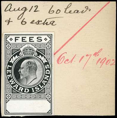 Fees: 1902 (Oct 17) Stamp sized die proof of headplate, in black on glazed card, affixed to piece from De La Rue striking book (55x55mm), and annotated at top in black 'aug 12 60 leads + 6 extra', with red date and diagonal line at right. A unique proof, Ex De La Rue archives.