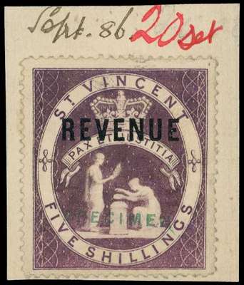 1883-93 5s Lilac, opt 'REVENUE', opt 'SPECIMEN' in GREEN, affixed to piece from De La Rue Striking book dated 'Sept 86' in black ms and endorsed '20 set' in red, tieing this example to the order of 2,000 of the 5s value, placed 11th August 1886. The De La Rue File copy and unique in this form. Wonderful! McClellan R26 | SG 26