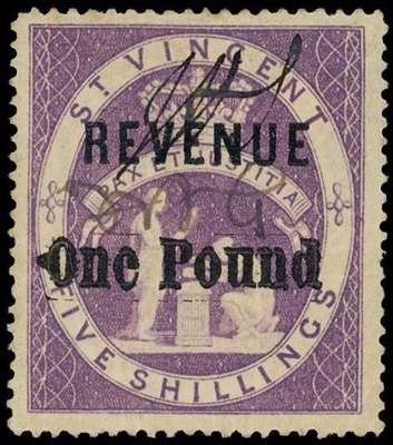 1893-95 'One Pound' on 5s lilac, very fine used, neatly cancelled with two sets of ms initials. Minor gum wrinkles of little consequence and not affecting superb appearance. A rarity of which it is believed just 545 were printed with a low survival rate. Ex Jaffé. McClellan R46 | SG 46