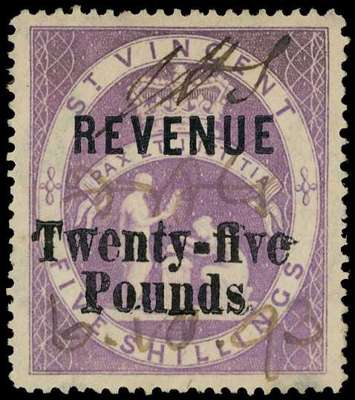 1893-95 'Twenty-five/ Pounds' on 5s lilac, fine used with light ms cancellation dated '6.10.93'. A great rarity of West Indies Revenue Philately, which was missing from the great Jaffe collection, is unlisted in Pierce et al, and is almost certainly the sole surviving example of the 15 which ever existed. The stamp of record, illustrated in McClellan and Barefoot. McClellan R49 | SG 49