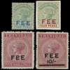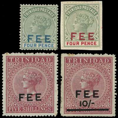 Fee: 1884-95 group of four trials for the issue, the pence trials (2) on wmk CA paper, without gum, both denominated 4d, with value tablets and overprint in blue and red rather than the issued black, offered with pair of Overprint trials for 'Fee' and 'FEE 10/-' in black, (both as issued) on 1869 5s rose-lake, (the design of which was used for the issue in different colours to the postage issue). A fascinating and unique set of early trials, ex De Vries