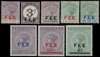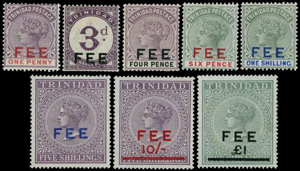 Fee: 1884-95 1d to £1 set of eight, fresh and fine large part o.g., and including the 3d 'Surcharge Postage', (albeit with trimmed perfs at foot) of which only a handful of recorded examples are known. A desirable set in a wonderful state of preservation, by some distance the finer of the two unused sets recorded. McClellan F13/20