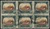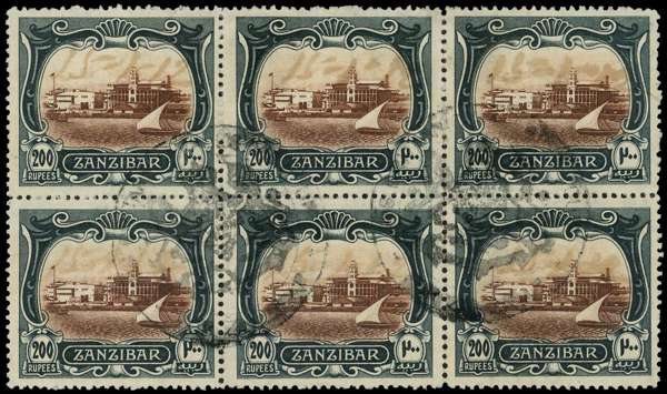 1908-09 200r brown and greenish black, block of 6 (3x2), fiscally used with two complete armorial court cancels and M/S '15-1-12' dates. Upper row with minor separation but a spectacular and rare multiple, in remarkably fine condition. SG 245