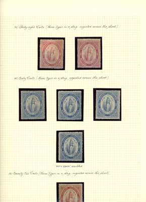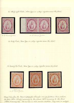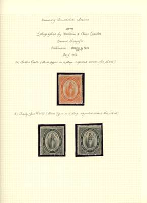 Summary Jurisdiction: 1866 group of proofs and trials comprising 48c and 96c COLOUR TRIALS in unissued milky blue, 12c orange bearing 'WATERLOW & SONS LIMITED' handstamp diagonally in black, in a type unlisted by Samuel, also 10c blue perf 10 and 12c blue perf 12 affixed to archival card, believed by the vendor to be ex Waterlow Archives. A super lot, the colour trials almost certainly unique.