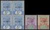1899 5c ultramarine, 10c mauve and green and 25c red-brown and green, each showing variety 'BEVENUE' (R6/4 of the setting), fresh large part o.g., the 5c offered in a block of four (one 'normal' thinned), the 25c with diagonal gum bend, still a fine and scarce trio. (cat £775) SG 66a, 67a, 68a
