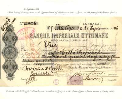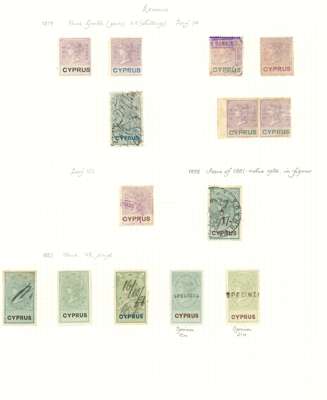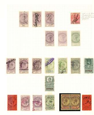 Small collection on 5 album pages comprising 1883 'POSTAL SURCHARGE' handstamps (10), all used, with values to 10s, QV revenue issues (22) including two Specimens, and 1883 2pi, 4½pi green, and 1pi on complete foreign bill document, used KEVII and KGV issues (15) and fiscally used postage stamps (21) to £1. A good basis for expansion, the complete foreign bill most attractive.