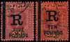 1912-27, 'R' and 'FIVE POUNDS' and 'TEN POUNDS' on £1 purple and black on red (Die I), each very fine used, cancelled with faint crayon line and part Customs oval in black, the £5 from the foot of the setting (denoted by break in line obscuring postage tablet at foot). A remarkable pair the £10 of the highest rarity. McClellan R75, R76