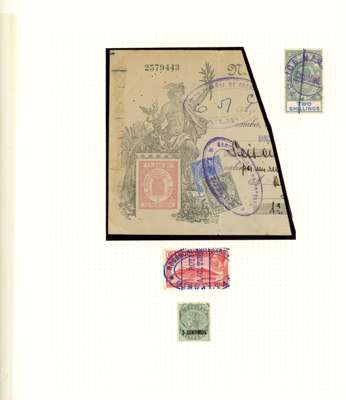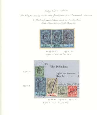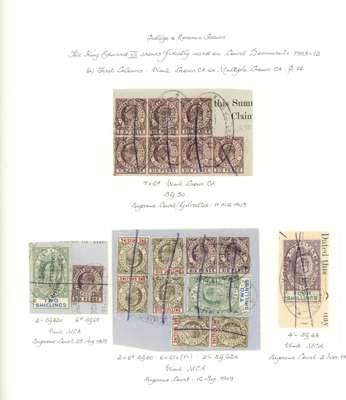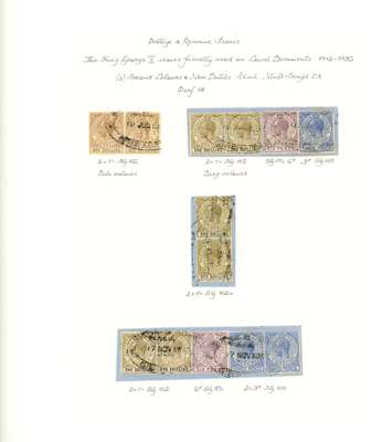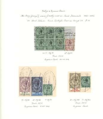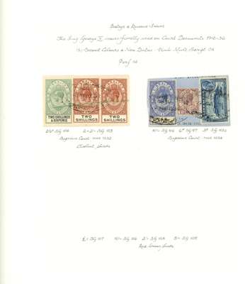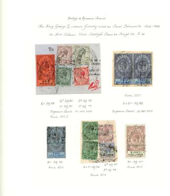 1903-75, collection of Postage Stamps fiscally used, beautifully written up on 21 pages, the vast majority on original piece, and attractively cancelled including King Edward VII document pieces (10), bearing values to £1 (2, SG55 and 64), King George V Document pieces (13) with values to £1 (2, SG 85 and 107), and £5 violet (SG 108) fiscally used, with slightly washed colour, King George VI values (33) to £1 (11 examples), and QEII attractive multiple frankings to £1, including SG158 (6) and 173 (6). A very fine lot, clearly selected for condition and quality throughout.
