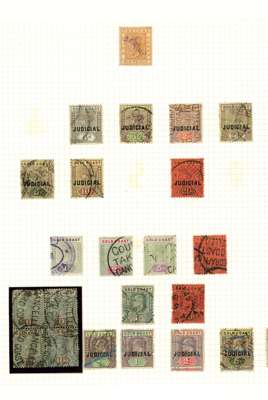 Judicial: 1902-03 collection on two pages including QV values to 20s used (8), and KEVII 2nd issue 1d to 1s and 5s fine mint and 1s (2), 2s (2) 5s (2) and 10s used, offered with fiscally used postage stamps (11) including QV 10s block of four and 20s, and KEVII 20s used, all with court cancellations. Condition a little mixed in places, still very fine overall for this popular issue.