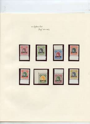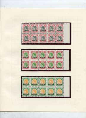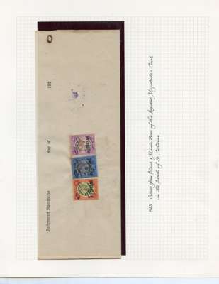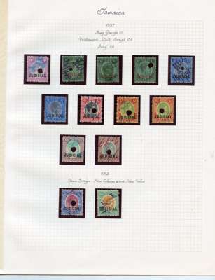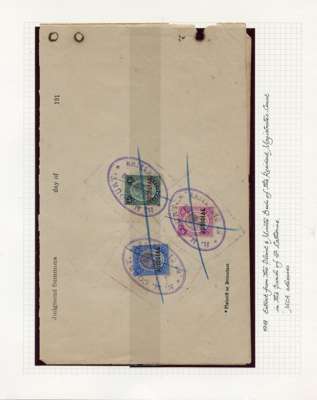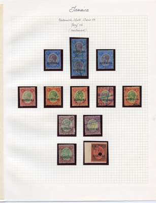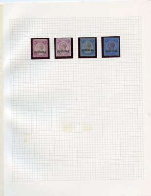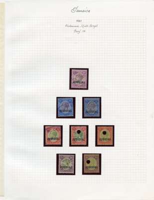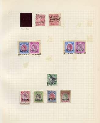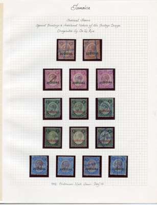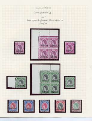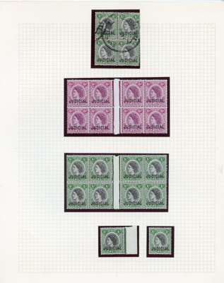 Judicial: 1913-76 collection on pages comprising KGV used values (27) including a complete set and use on documents (3), with mint 6d (2) and 2s (2), KGVI used values (13) to 8s6d plus 10s and £1 (2) used on 'Plant and Minute book' document tied by punch and ms, QEII mint presented on six packed pages with blocks and multiples and values to £1, used values (27) to $1. A very fine representative lot, the KGVI document attractive and very rare. McClellan (from) J21/118