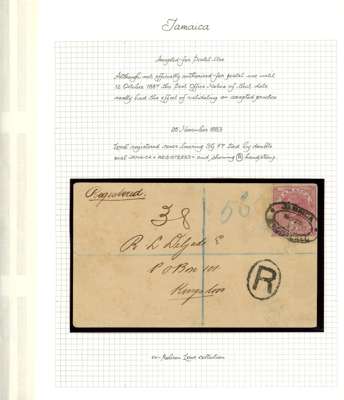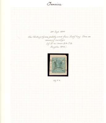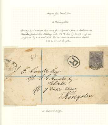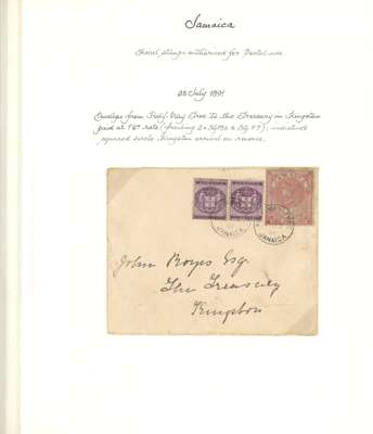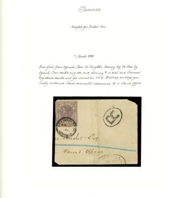 1858 Postal Fiscal issues group of three covers and four pieces, the covers comprising 1s rose on registered local cover, 1s rose philatelic combination franking with 1855 3d purple horizontal pair with arrival mark on reverse, sent locally in Kingston, 5s lilac on large format Registered cover sent to a solicitors in Kingston, folded for display and and toned, the pieces 5s tied to registered cover piece by Spanish Town cds, and 10s green on piece, tied by 1894 Halfway Tree cds. A super lot, which catalogues £2,000+ the 5s cover Ex Derek Nathan. SG F7, F8, F9