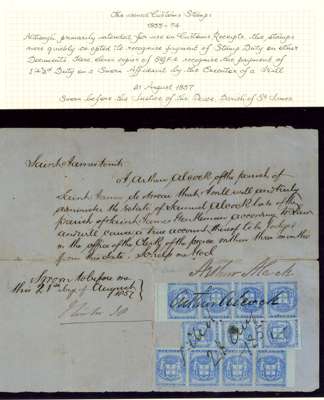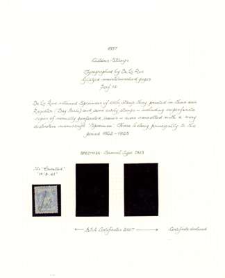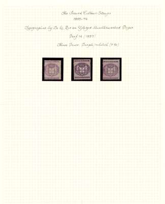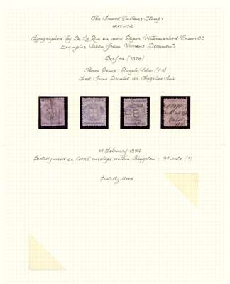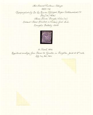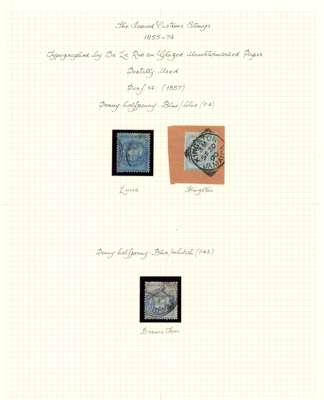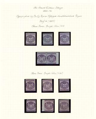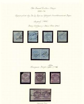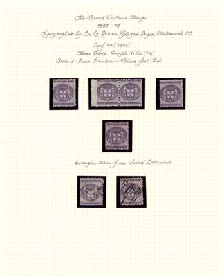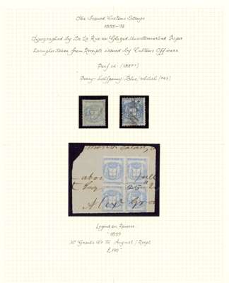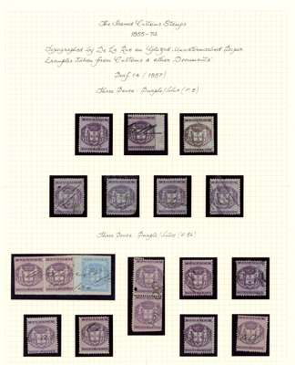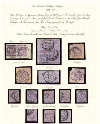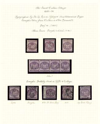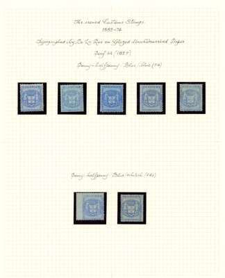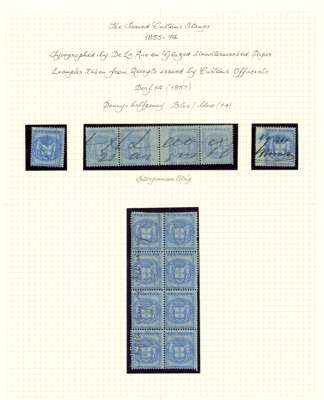 Postal Fiscal. 1855-74 Detailed specialised collection beautifully written up on album pages including 1855 imperf 1½d and 3d including a used pair of each, 1½d blue on blue mint examples (7) showing both papers, and fiscally used examples (25) including 11 used on an affidavit, and a block of 8, 3d purple on blue (5) and lilac (6) mint, and used (29), five with apparent postal cancellations. and second issue on wmk CC paper, mint (6), and used (29) showing a wide range of postal cancellations. A comprehensive and interesting study of these fascinating issues with high catalogue value. SG F4/6